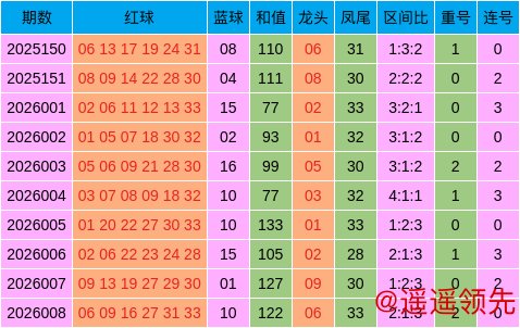 红球三区分析:上期三区【23-33】奖号开出27、31、33,近5期出号个数分别为:1、3、3、3、3,该分区本期推荐关注号码:26。